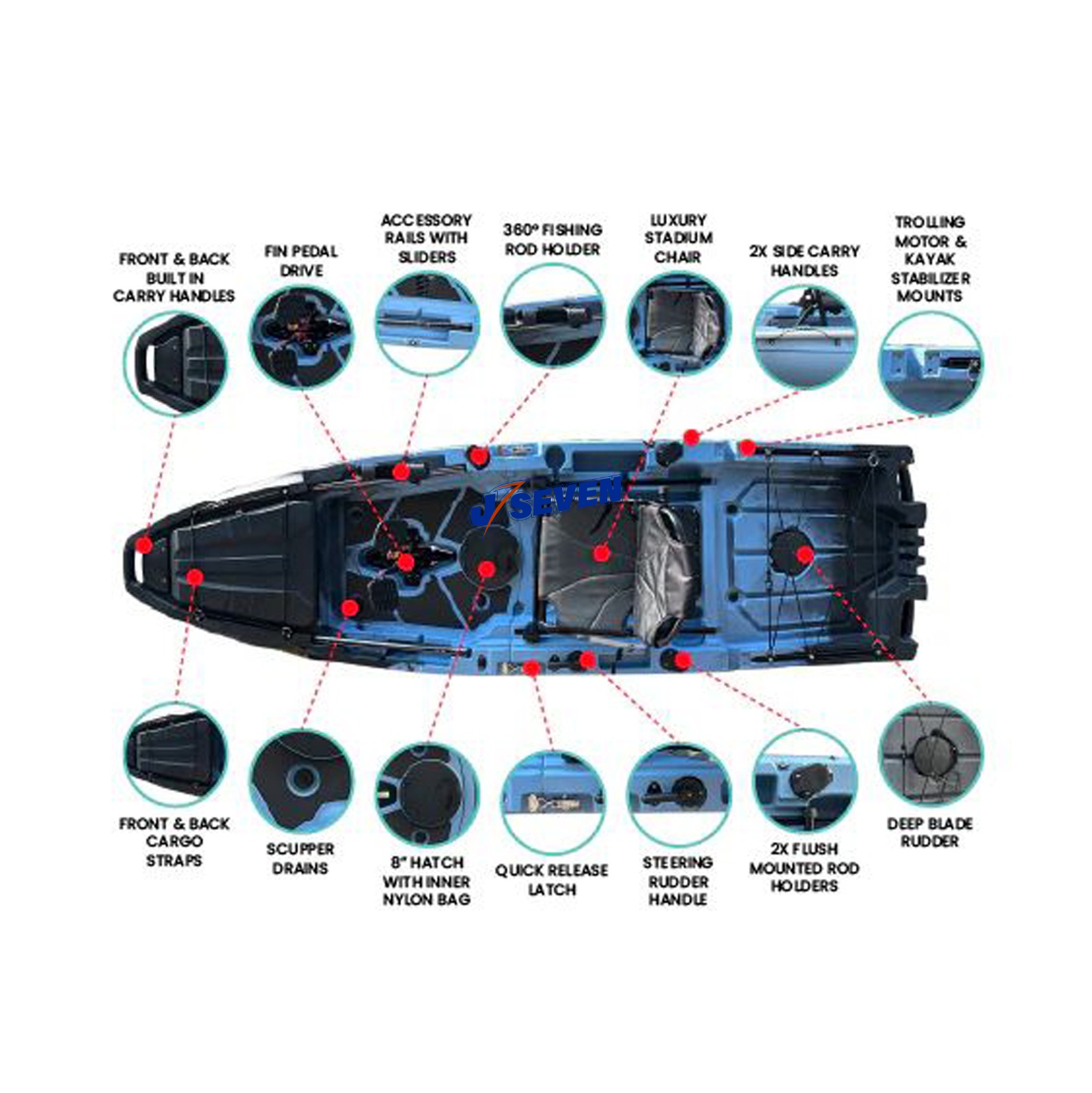 Kayak J Seven Alesandra Modular V2 10,5 kaki dengan penggerak baling-baling adalah platform ideal untuk membuat sesi memancing Anda lebih menyenangkan. Kayak ini memiliki sistem penggerak pedal praktis yang memungkinkan Anda berakselerasi di air dengan sangat halus dan senyap, tanpa membuat ikan takut. Selain itu, kayak ini dilengkapi dengan semua perlengkapan yang Anda butuhkan untuk memancing, seperti rel untuk memasang joran, dudukan joran putar, dudukan kotak umpan, palka penyimpanan untuk perlengkapan tambahan, dan dudukan botol. Berat lambungnya hanya 33 KG, dengan berat masing-masing sisi 16.5 KG dan pegangan samping untuk kenyamanan dan kemudahan membawa. Kayak ini juga dilengkapi dengan kursi empuk yang nyaman untuk memancing berjam-jam lamanya, serta sistem kemudi berbilah dalam untuk membantu saat kondisi mendayung berubah. Kayak yang tahan lama dan kokoh ini merupakan platform memancing yang lebih lebar, menawarkan stabilitas dan bobot yang lebih baik, bahkan saat berdiri, sehingga wajib dimiliki oleh setiap penggemar memancing.